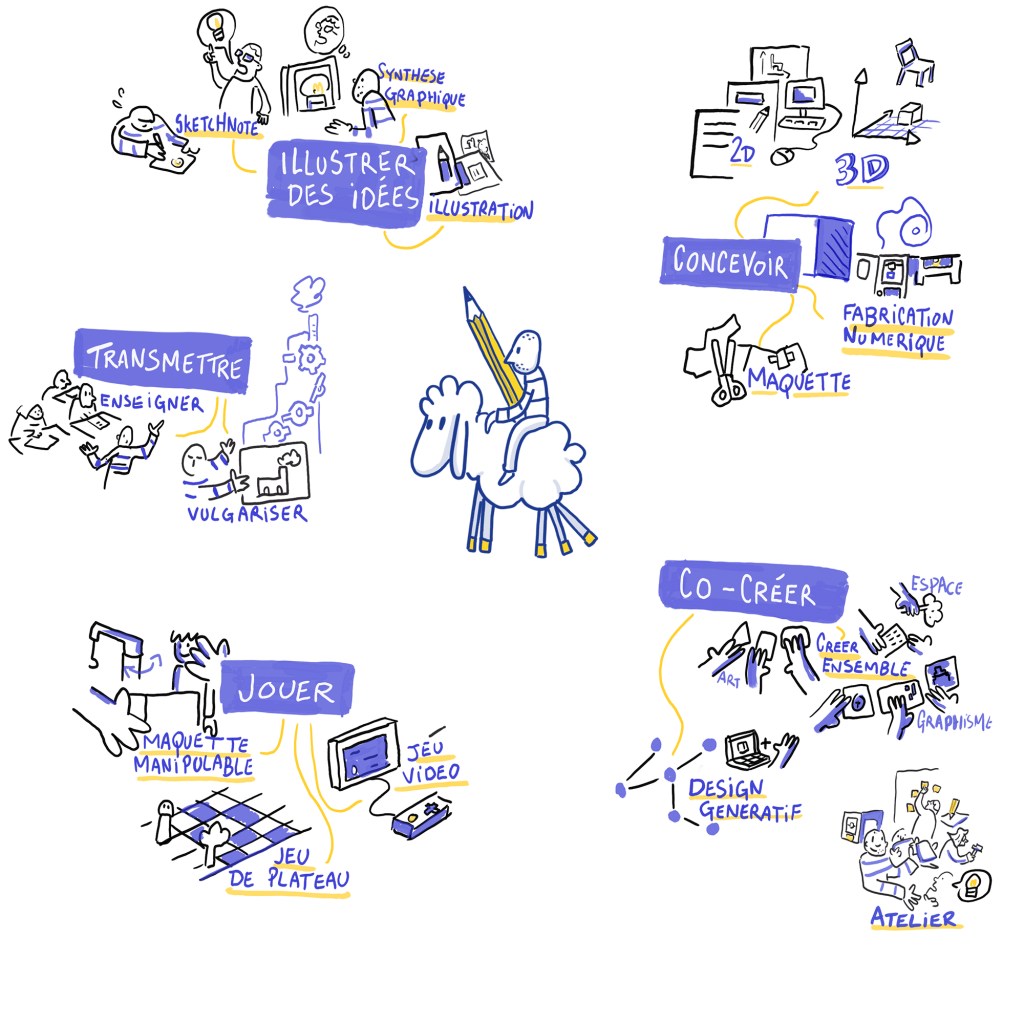 « Curieux, j’aime apprendre et transmettre. Mon goût pour la BD, la conception numérique et la pédagogie m’a conduit à développer une approche polyvalente et ludique du design, allant de la co-conception à la création numérique, en passant par l’illustration. »