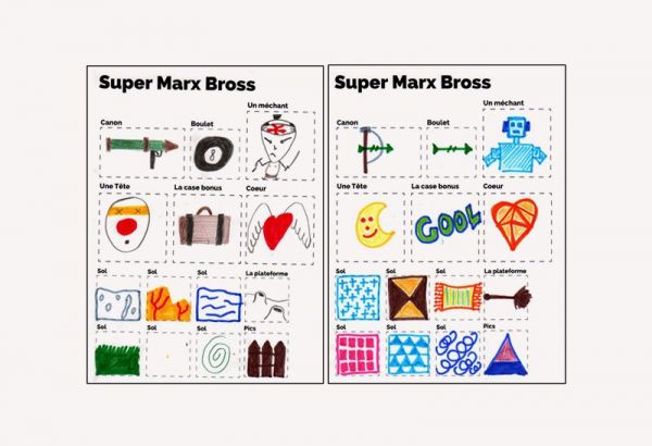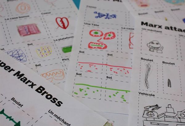 Les règlements ont été créé sur place et avec les moyens du bord (collage, photocopieuse..). L’édition est illustrée par les dessins des jeunes réalisés pour le jeu vidéo, mais utilise également la typographie Marxgram réalisée lors de plusieurs ateliers.