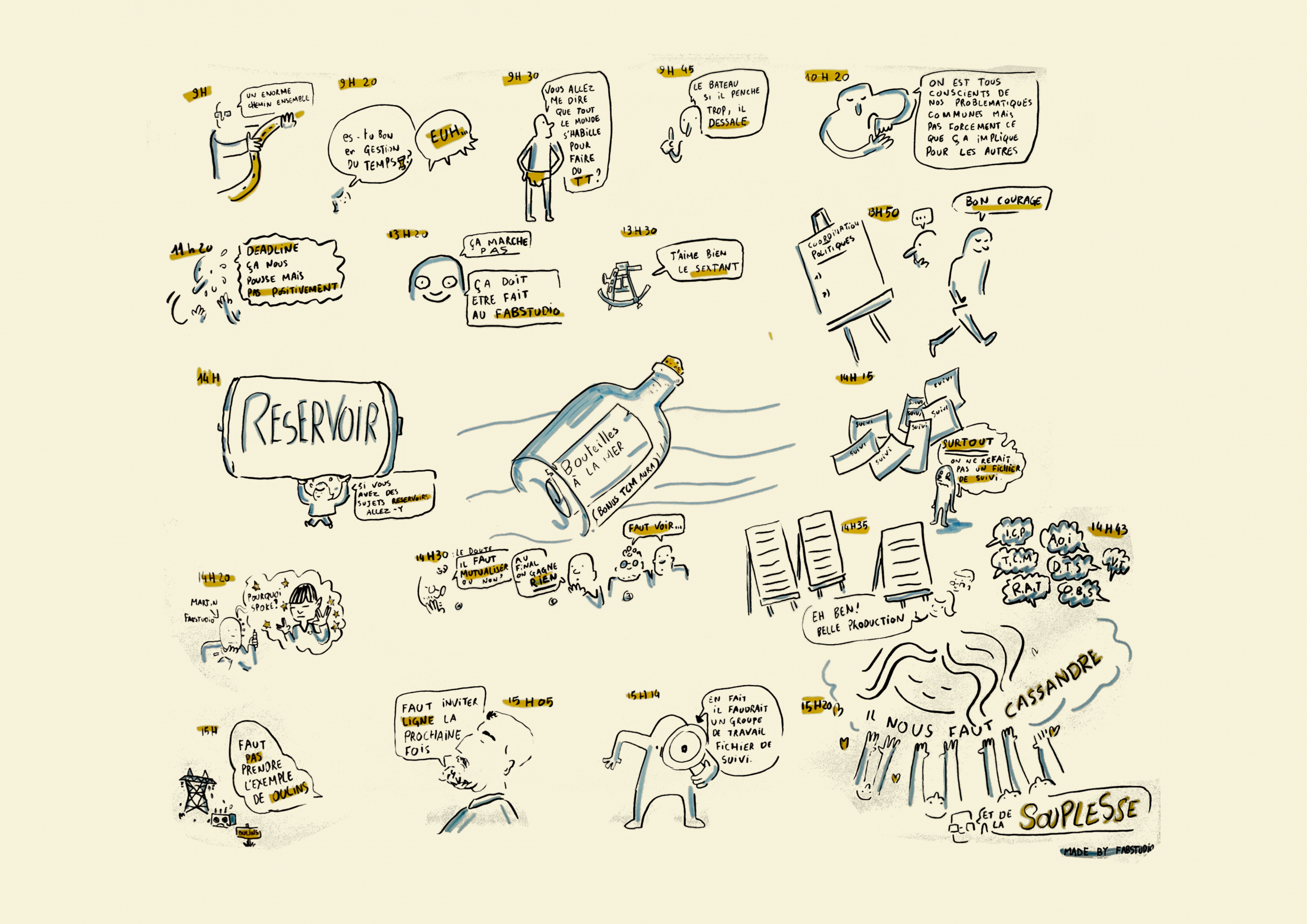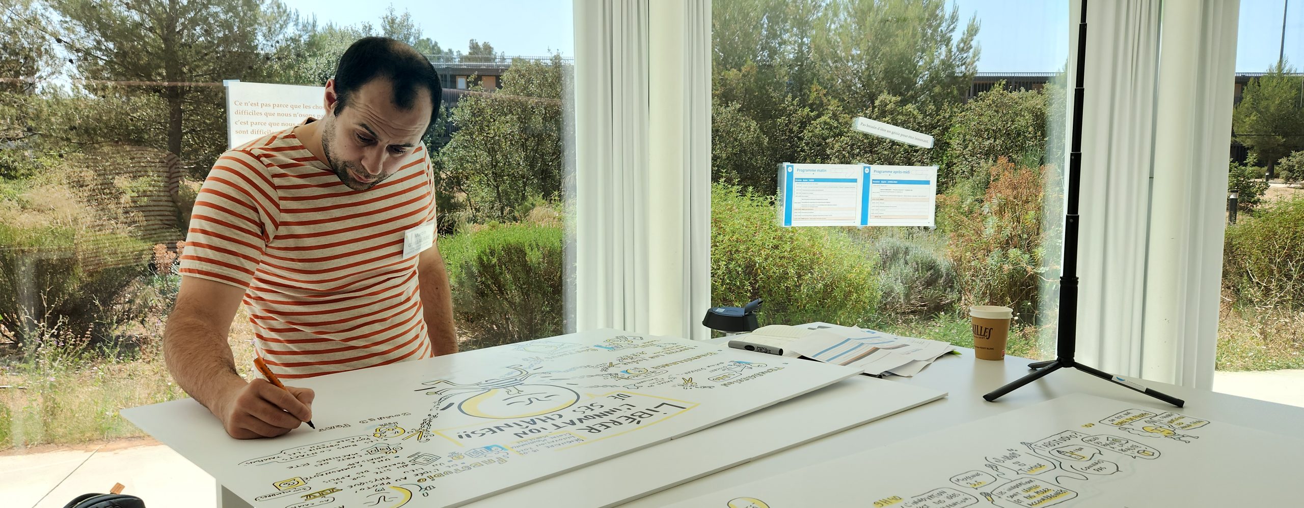 J’ai eu en charge de capturer les échanges de cette journée et de les présenter visuellement à l’ensemble des équipes. La facilitation graphique a permis de rendre accessible la complexité des enjeux, de structurer les nombreuses informations échangées et de créer un support commun pour l’action collective.